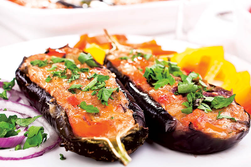 4. Se scot vinetele din cuptor, se umplu cu tocana de legume şi se servesc ornate cu mujdei de usturoi şi pătrunjel verde tocat mărunt.