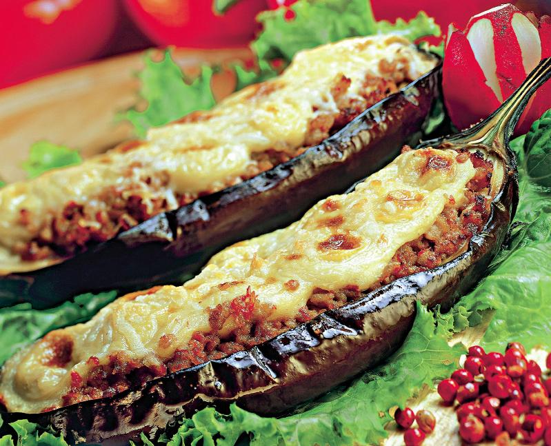 4. După ce au stat în cuptor, se scot, se scurg de suc şi se umplu cu compoziţia de carne. Pe deasupra se gratinează cu caşcaval şi se mai lasă să stea la cuptor până se rumenesc. Se servesc ornate cu cimbru verde sau uscat, aşezate pe frunze de salată.