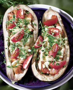 4. Se spală şi se opăresc roşiile, se decojesc şi se taie cubuleţe. Miezul de vânătă se amestecă cu roşiile, se condimentează cu sare şi cimbru şi se bagă în cuptorul încins.