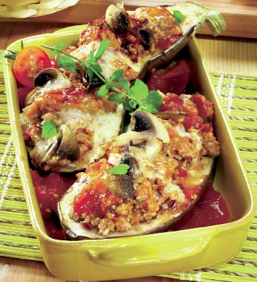 3. Separat, se spală şi se curăţă ciupercile, apoi se taie jumătăţi. Se umplu vinetele cu compoziţia de carne, se pun ciupercile, pesmet şi parmezan, pe deasupra, şi se aşază în tava tapetată cu unt şi pesmet.