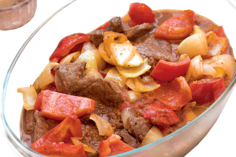3. Ardeii şi prazul se curăţă, se spală şi se taie bucăţi potrivite. După ce s-a pătruns carnea bine, se adaugă ardeii şi prazul, se acoperă cu un capac şi se lasă la foc mic să fiarbă în sucul propriu. La sfârşit se pune pasta de roşii şi se mai lasă câteva minute pe foc.