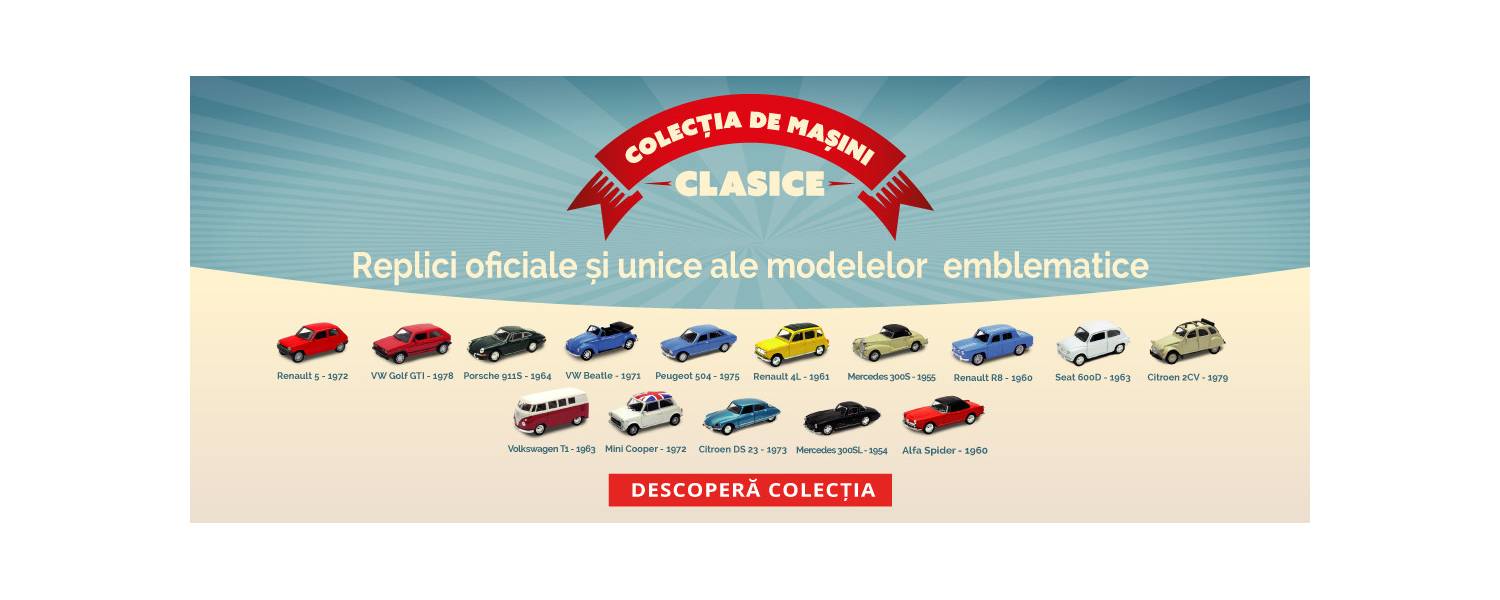 Tu sau copilul tău sunteți pasionați de mașini clasice de colecție? Atunci achiziționează toate cele 14 replici oficiale și unice ale modelelor emblematice, de o calitate deosebită, disponibile pe colecții.libertatea! Poți comanda deja în avans șase ediții. Nu rata! Prima ediție, Renault 5, o poți cumpăra cu 50% reducere, la prețul de numai 24,99 RON!