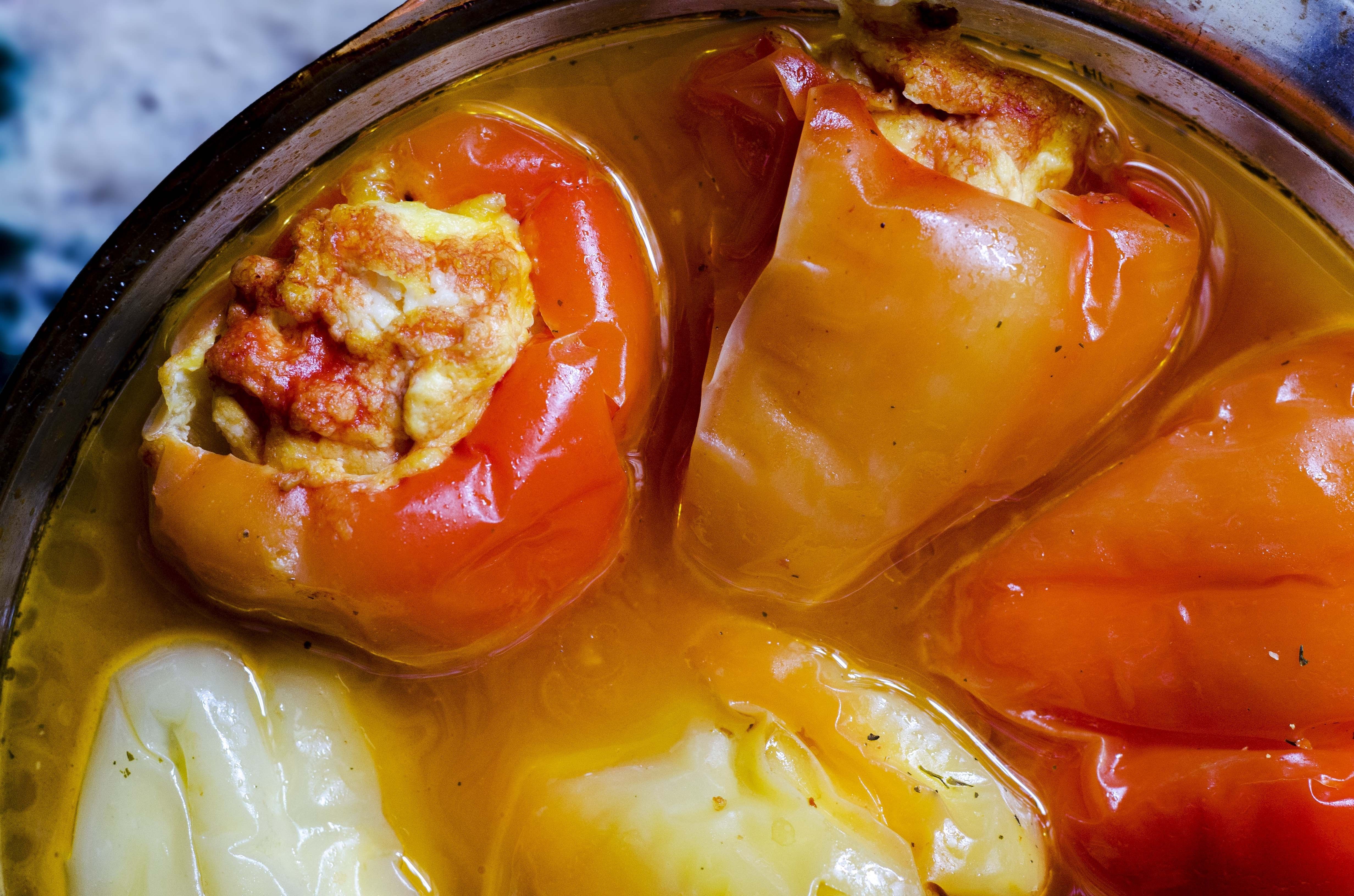 3. Asaza ardeii umpluti intr-un vas termorezistent, intr-o parte. Deasupra lor toarna sosul de rosii si completeaza cu apa, pana la jumatatea inaltimii ardeilor. Da preparatul la cuptor pentru 40-45 de minute la 180 grade, intorcandu-i la jumatatea timpului de preparare.