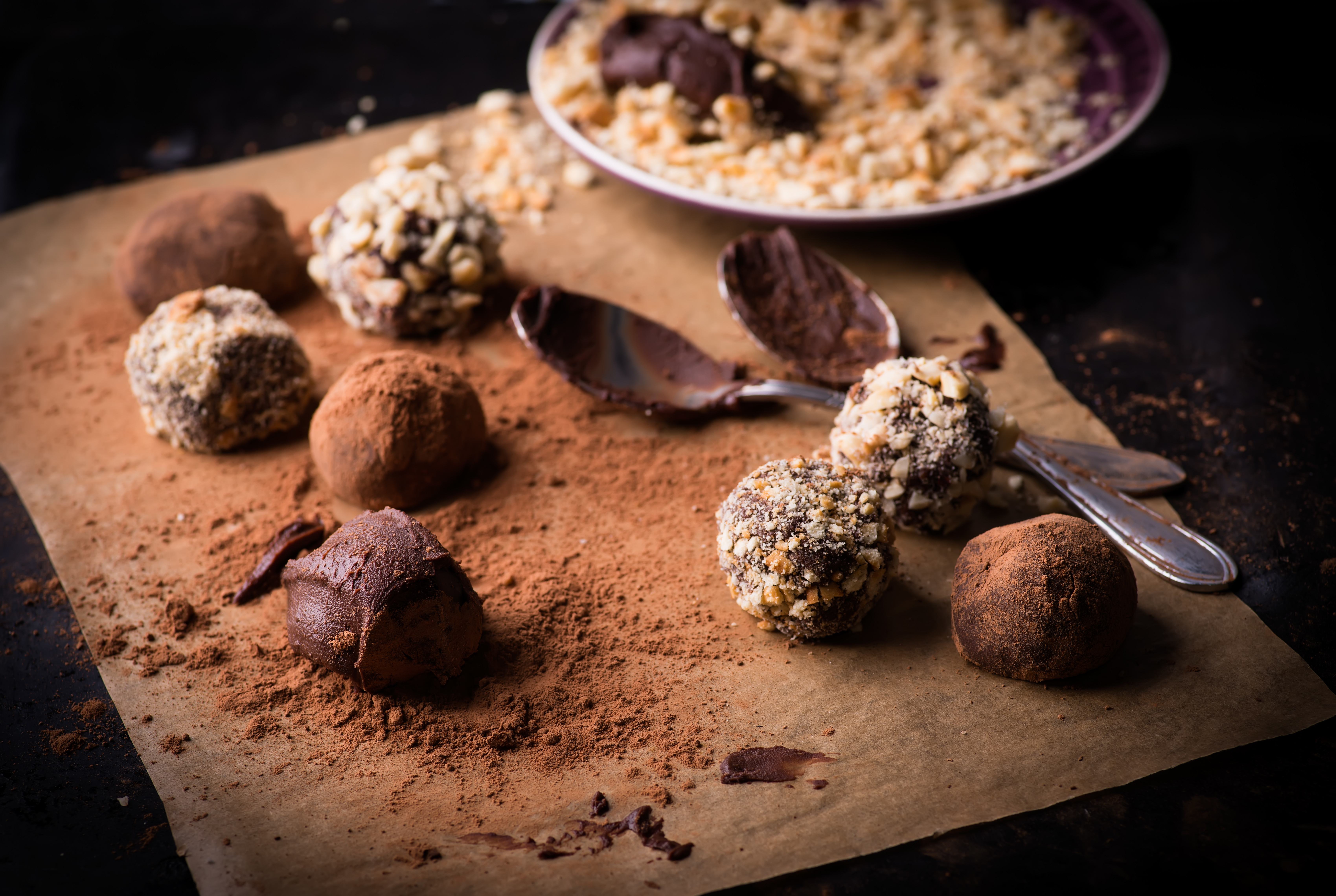 - Omogenizați, formați biluțe de dimensiunea nucilor și tăvăliți-le prin amestecul de alune și ornamente de ciocolată. De asemenea, pentru mai multă diversitate, biluțele se pot da și prin fulgi de cocos, cereale sau cacao.