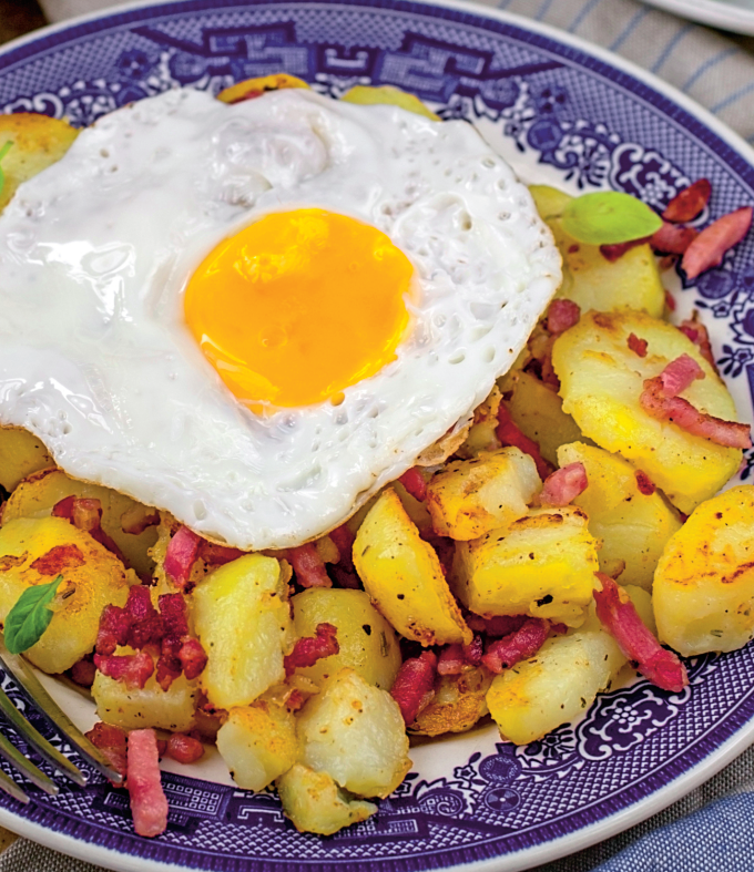 - Se lasa sa se evapore si se adauga de inca doua ori cate 2 linguri de apa. Apoi se pune baconul. Se lasa un minut, se adauga restul uleiul si se pun si cartofii fierti taiati cuburi. Se amesteca, se presara cu piper si se lasa pe foc aproximativ 10 minute.