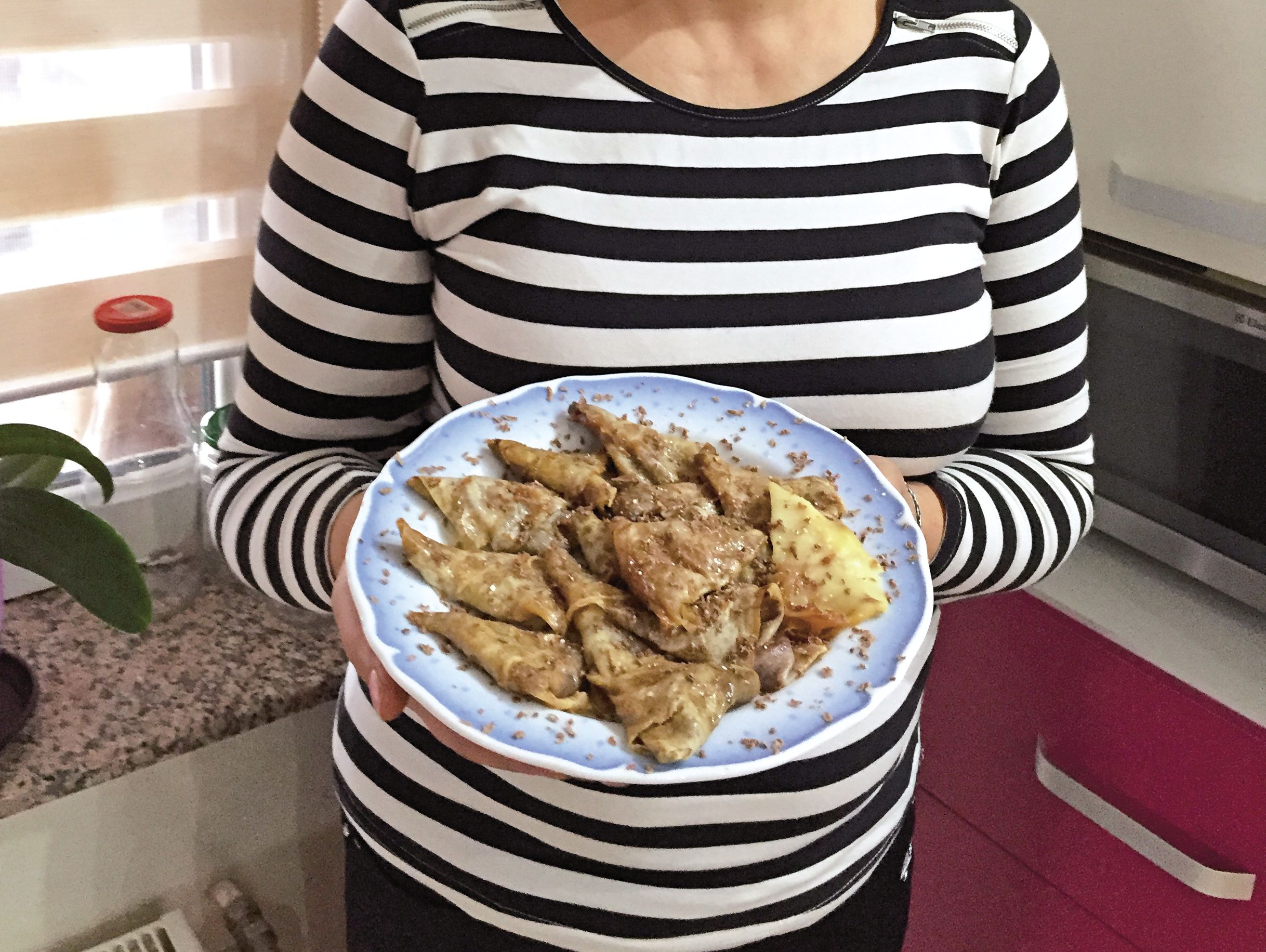 3. Se pune cate o lingura de crema în fiecare clatita, se împacheteaza, dupa care se pun într-un vas de yena uns cu unt. Dupa fiecare strat de clatite, se pun si cateva cuburi de unt.