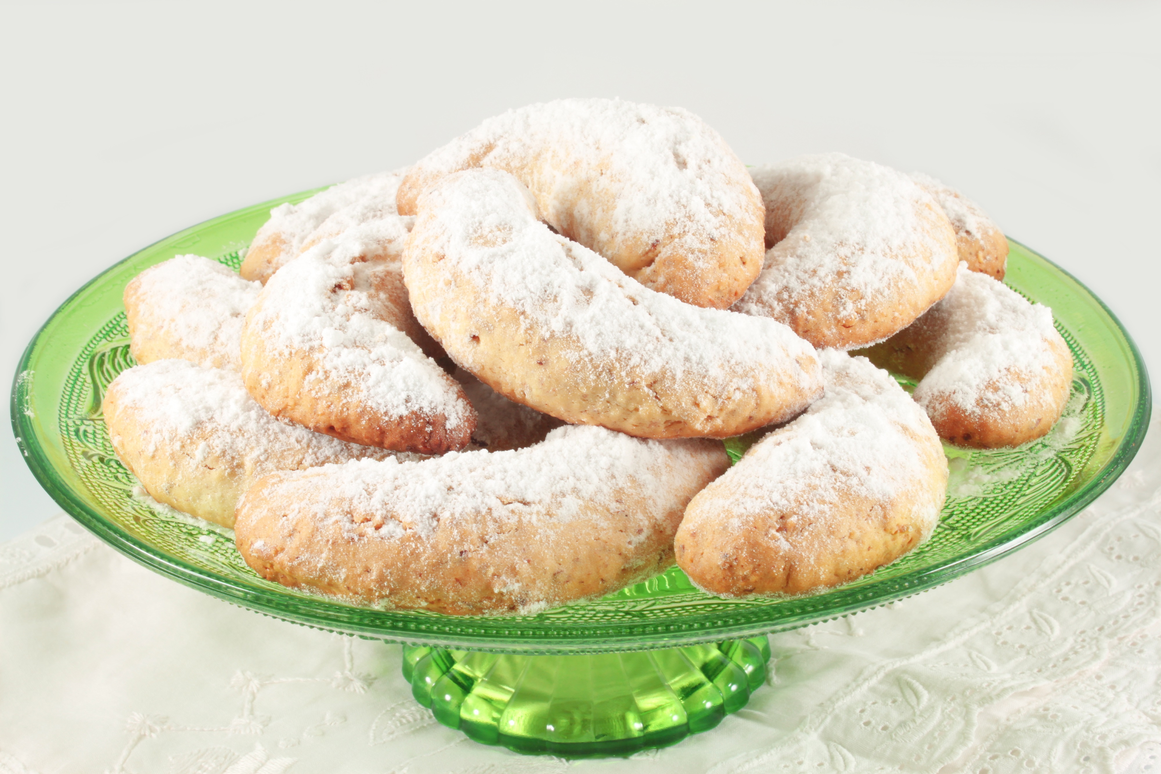 3. Incovoiaza cornuletele incat sa capete forma de semiluna si asaza-le pe o tava tapetata cu foaie de copt. Da piscoturile la cuptorul preincalzit pentru 8-10 minute la 180 grade, pana devin usor aurii, apoi serveste-le pudrate cu zahar din belsug.