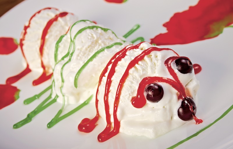 3. Se amesteca energic si apoi se repune pe foc mic, eventual, pe o tabla, amestecand pana cand devine groasa. Se strecoara si se lasa la racit. Se amesteca bine cu telul timp de 10 minute si se da la congelator pentru 3 ore. Inainte de servire, se monteaza pe farfurie cate trei „guguloaie”, sub forma unei gaze, care se orneaza cu fructe și sirop, dupa gust.