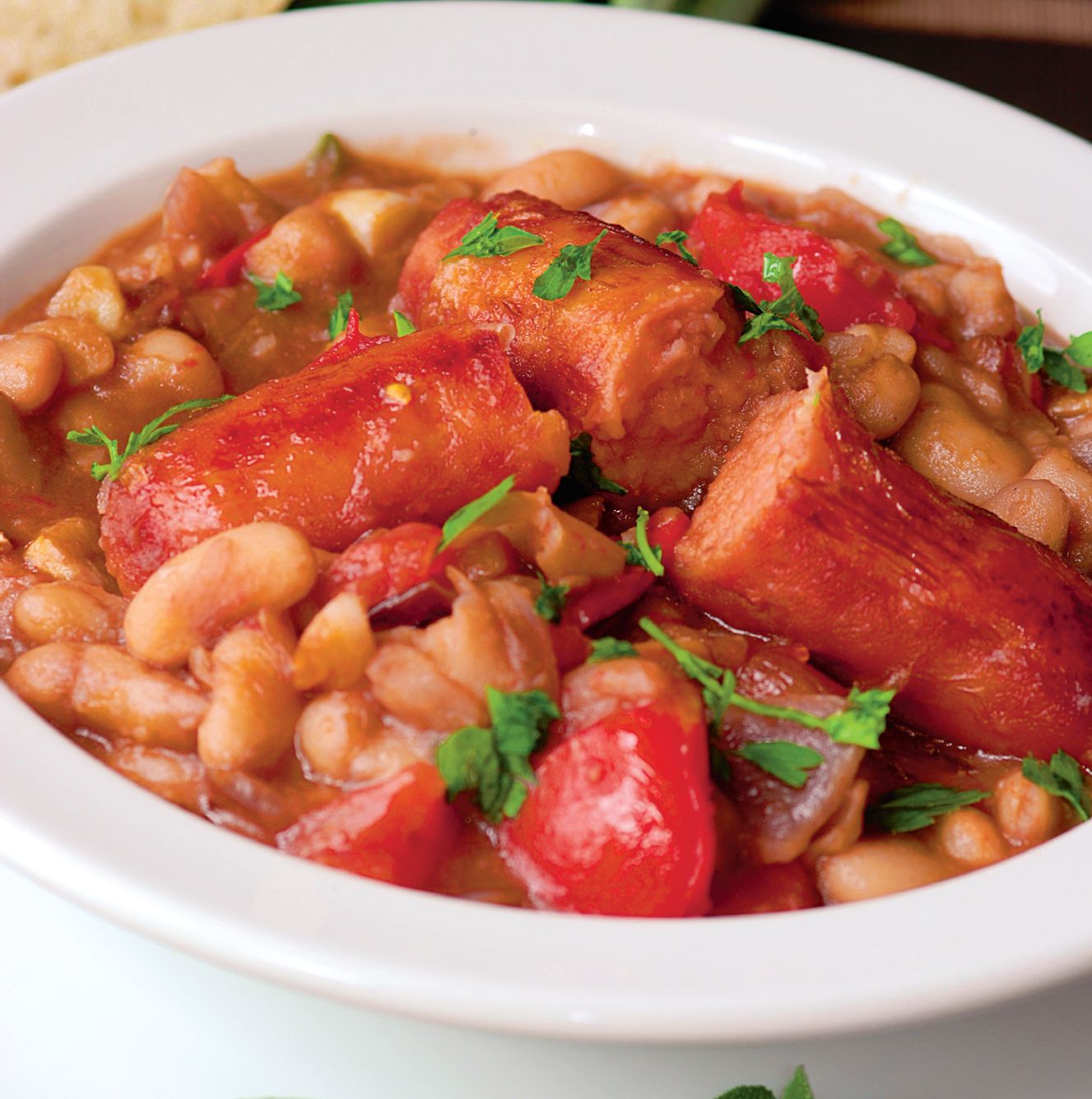 2 conserve fasole gata fiarta o ceapa un ardei gras 5-6 rosii in bulion 2 carnati de casa 2 linguri ulei sare o legatura patrunjel