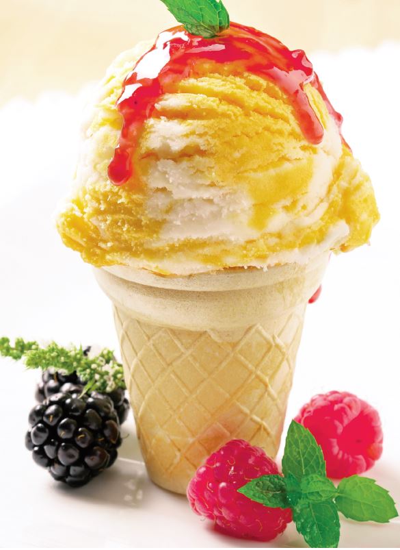 Se serveste in cornete de napolitana, ornata cu sirop de zmeura.