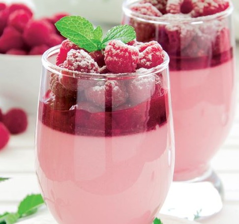 Frisca se bate bine, dupa care se toarna peste ea compozitia de zmeura. Se pune intr-un vas la congelator, pentru 3 ore.