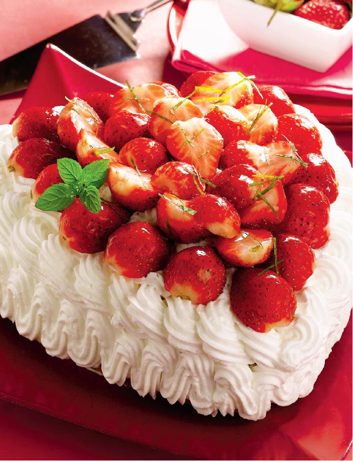 Se scoate blatul din tava, se taie in doua foi, se insiropeaza usor cu amestecul de miere si lichior, incalzit pe foc, si se asaza pe platoul de servit. Se bate frisca foarte rece, se pune intr-un pos si se decoreaza lateralele inimioarei. In centru se asaza capsunele taiate in jumatati. Pentru ca frisca lichida sa iasa perfecta trebuie tinuta la frigider 2-3 ore inainte de a fi batuta.