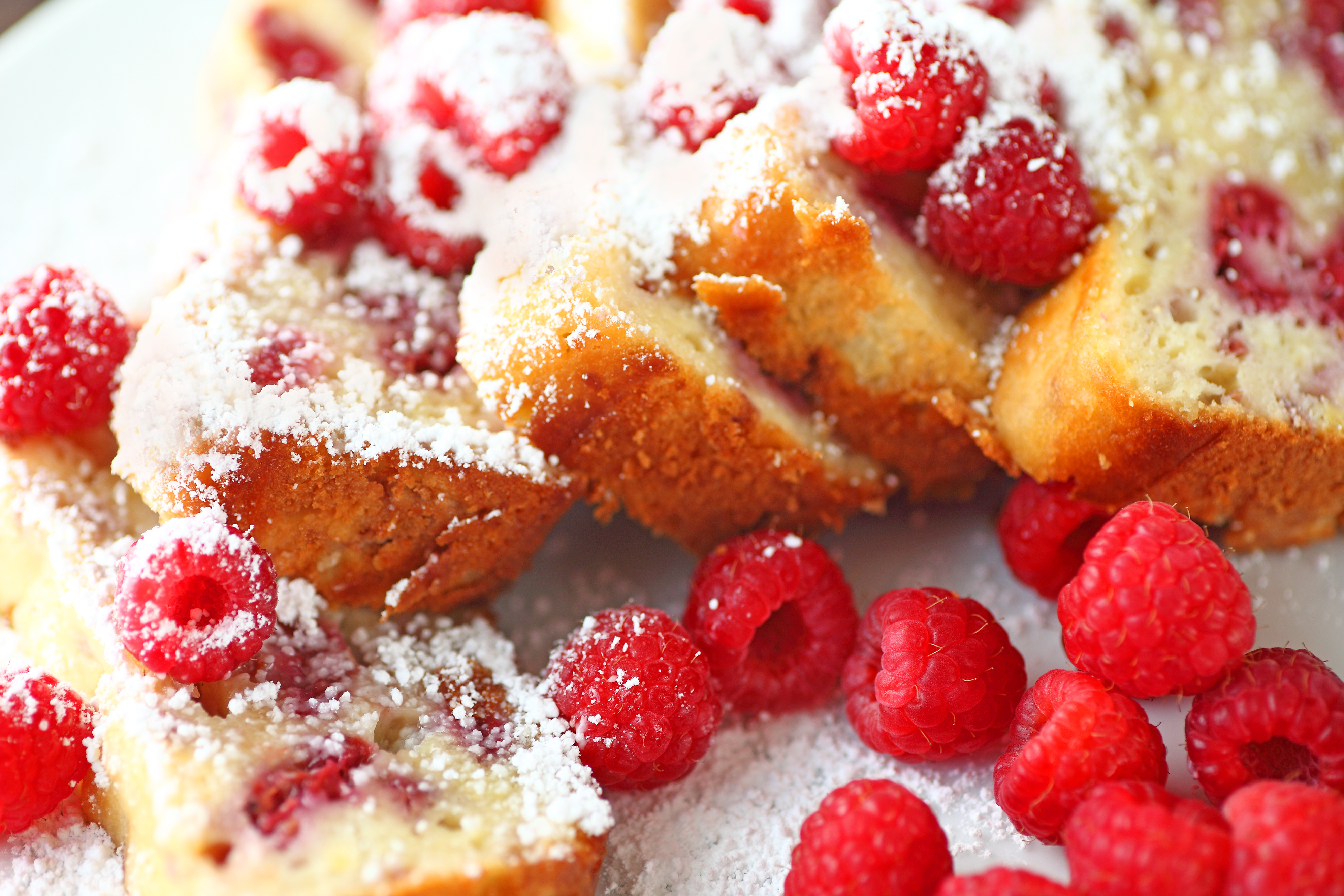 3. Se toarna aluatul într-o tavă de chec,  tapetată cu hârtie de copt, se așaza deasupra zmeura, și se coace 25-30 de minute. După răcire se taie și se servește cu zahăr pudră deasupra.