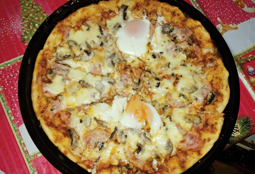 - Peste sos se aranjeaza parmezanul, feliile de mozzarella, sunca si ciupercile taiate feliute si se da pizza la cuptor, la 180°C. Dupa 20 de minute, se scoate tava din cuptor, se sparg deasupra ouale, apoi se mai lasa inca 10 minute la copt.