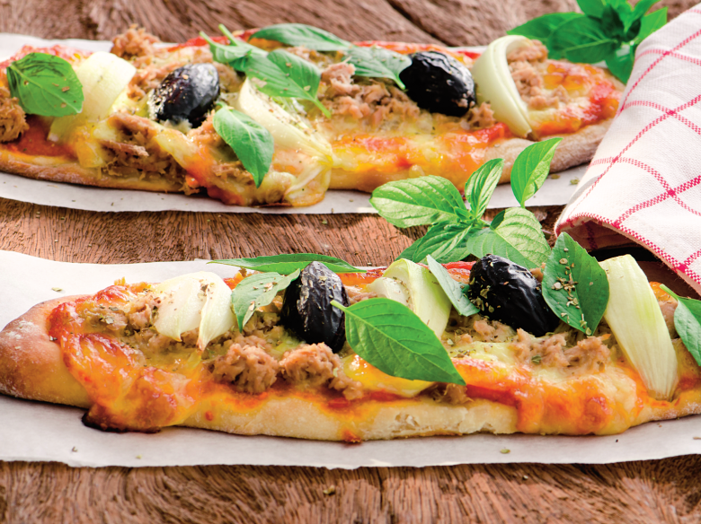- Se intinde aluatul si se transfera apoi in tava de copt unsa cu foarte putin ulei, se unge cu sos, se pun tonul, cealalalta ceapa taiata pestisori, mozzarella si maslinele. Se da la cuptor pentru 20 de minute.
