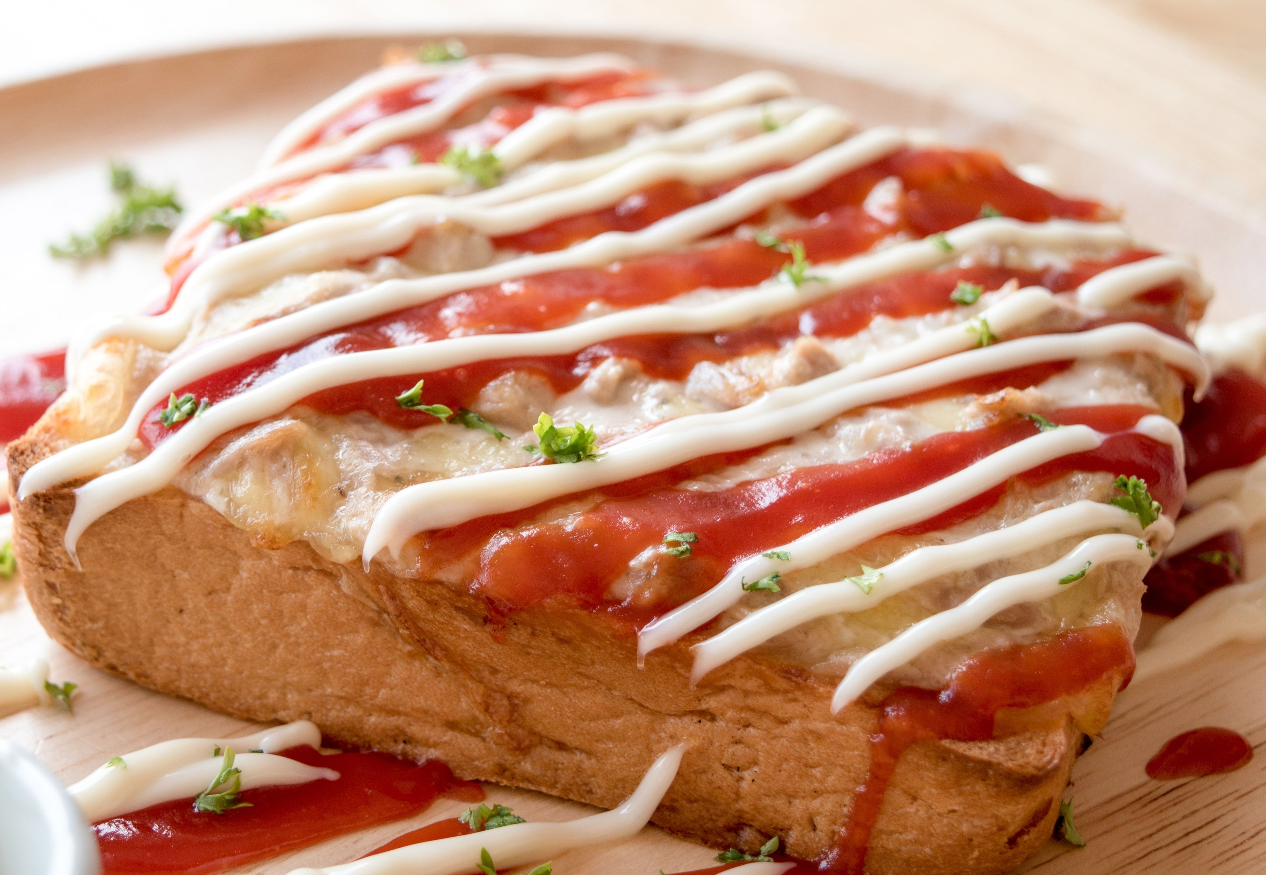 10 felii de paine 4 linguri sos de rosii 2 linguri de unt 2 rosii 2 cepe mici 2 fire de ceapa verde bacon/sunca cascaval ras sare piper