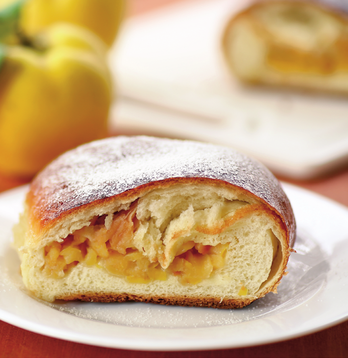 4. Aluatul se imparte in doua si pe mijlocul fiecarei bucati se repartizeaza gutuile. Se ruleaza si se transfera intr-o forma de copt unsa putin. Se coace placinta pentru 40 de minute.