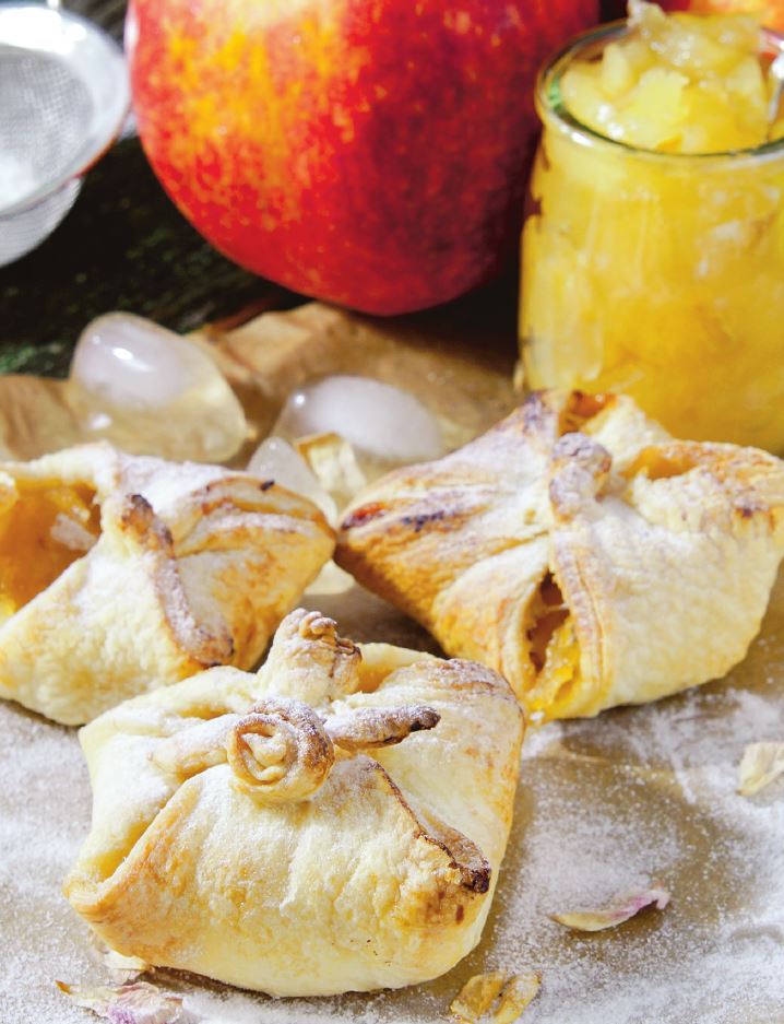 Aluatul se intinde putin pe masa presarata cu faina si se taie patrate. Merele, spalate, se curata de coaja si se taie cuburi mici. Se presara cu zahar si scortisoara si se amesteca, astfel incat sa fie acoperite. Pe fiecare patrat se pune o lingura de cuburi de mere.