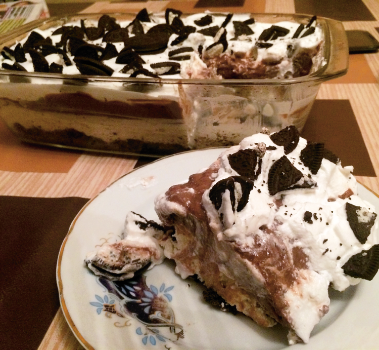 - Peste blatul din biscuiti se pune crema de branza amestecata cu frisca, apoi se toarna si budinca de ciocolata, iar ca ultim strat se pune frisca ramasa. Se poate orna cu bucatile de biscuiti din al 3-lea pachet.