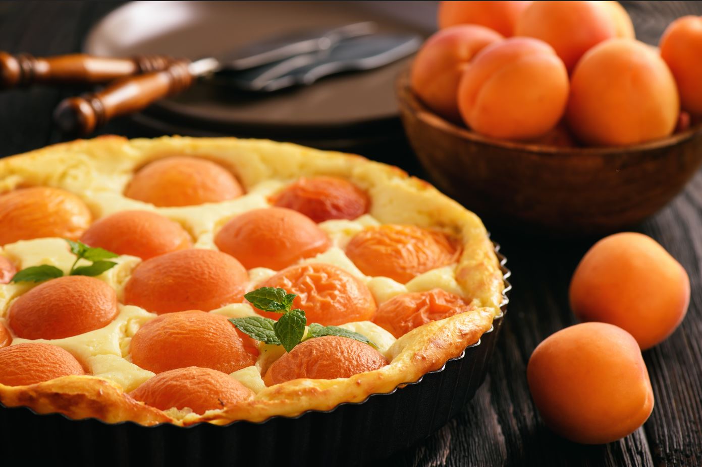 - Pentru umplutură, brânza se mixează cu ouăle, grișul și zahărul. Peste aluat se pune un strat de caise, curățate de sâmburi și apoi brânza.