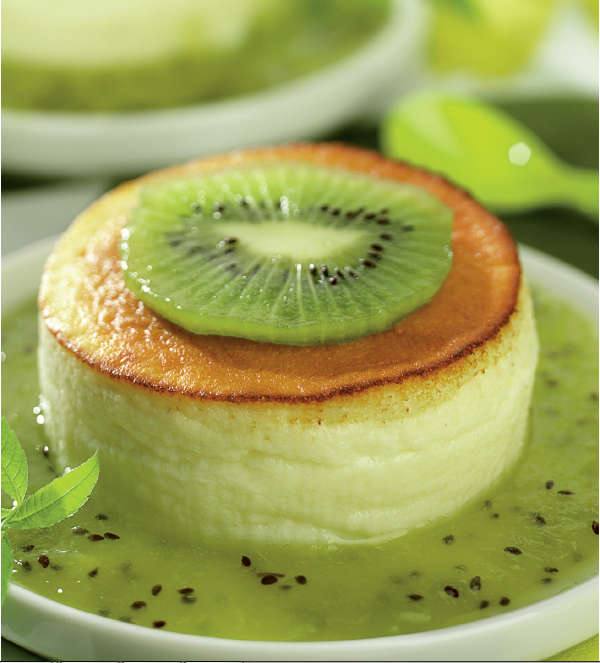 Prajitura racita se scoate din vas prin rasturnare si se aduce la masa cu sosul de kiwi si o felie de kiwi deasupra.