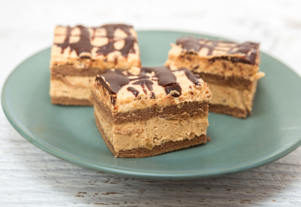 4. Taie blatul copt in jumatate, pe lungime, si asaza un strat generos de crema caramel. Asaza si cea de-a doua jumatate de blat, iar deasupra intinde un alt strat gros de crema.