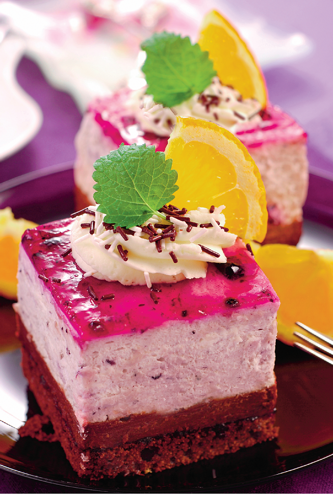 Blatul copt si racit se asaza intr-o tava si se unge cu gem de afine. Apoi, se toarna crema de ciocolata. Se lasa un pic sa se raceasca asa si apoi se pune spuma de afine de la rece. Se prepara gelatina de decor si se toarna dupa ce s-a racorit. Se da la rece pentru 6 ore. Se taie si se aduce la masa cu frisca deasupra, bombonele decoratiuni si felii de portocala.