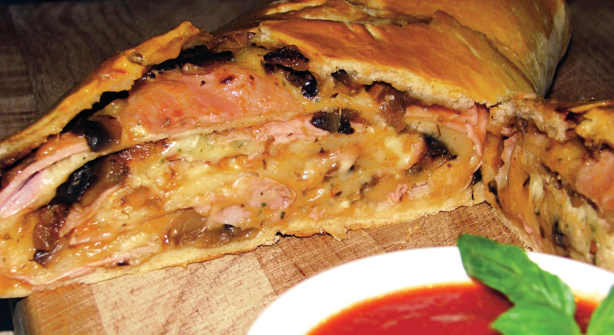 4. Se intinde o foaie subtire din jumatate din aluat, se intinde un strat de sos tomat, o jumatate din cantitatea de ciuperci bine imprastiate pe tot blatul, felii foarte subtiri de sunca (tot jumatate din cantitate) si jumatate din mozzarella rasa.