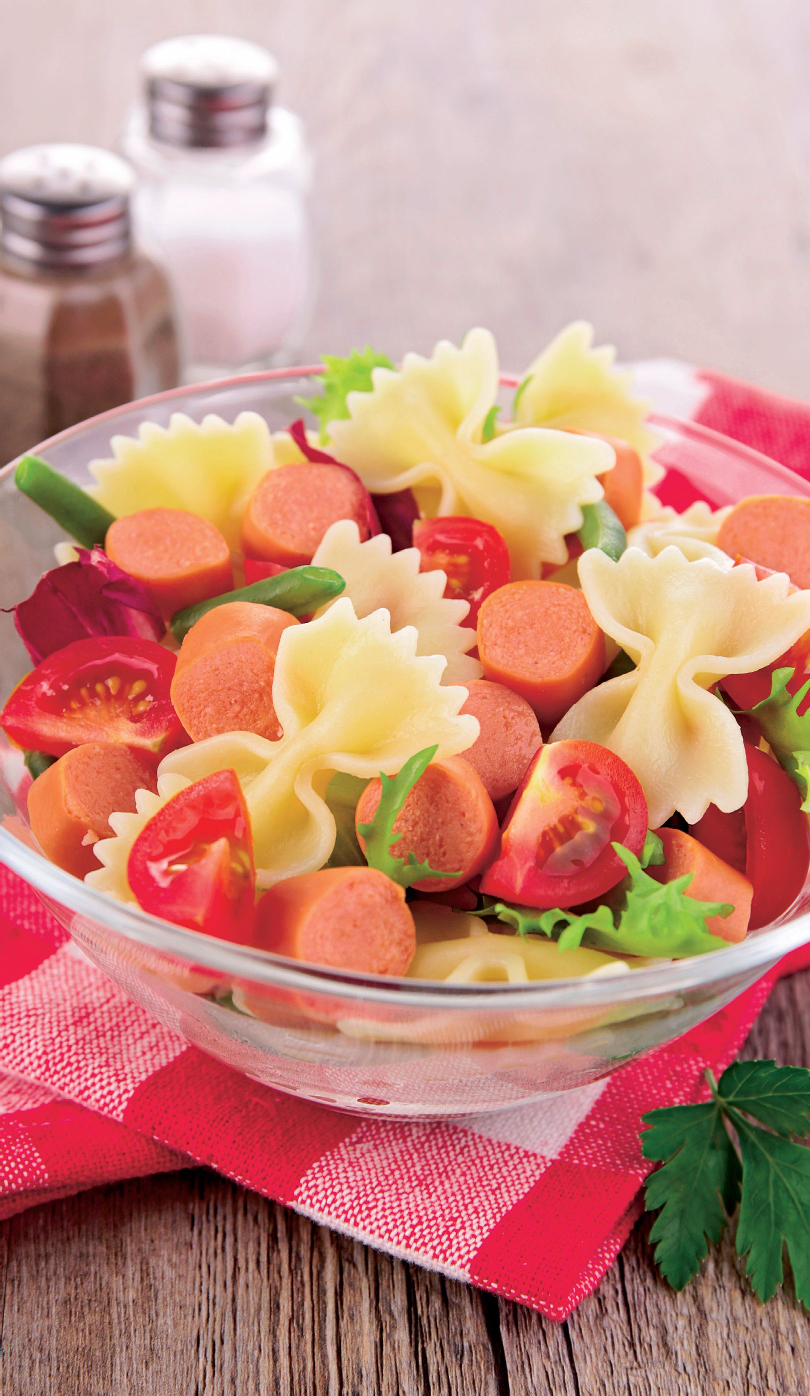 - Se adauga crenvurstii taiati rondele, rosiile taiate sferturi, fasolea verde trecuta sub jet de apa rece si salata.