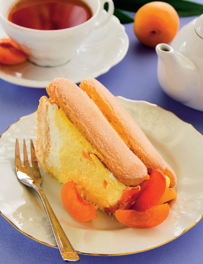 Se pune crema de branza in forma, se niveleaza, se asaza drept capac restul piscoturilor inmuiate, se acopera cu folie si se lasa la rece pentru 2 ore. Se serveste cu feliute de caise proaspete.