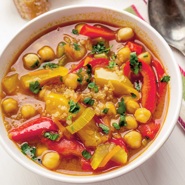 o cana boabe de naut 2 linguri quinoa 2 ardei grasi de culori diferite 2 rosii foarte coapte o ceapa o felie radacina telina patrunjel