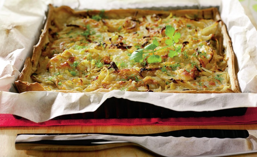 4. Se scoate aluatul, se inlatura fasolea, se pune feniculul si se coace 20 de minute. Se poate aduce la masa cu cascaval suplimentar presarat deasupra.
