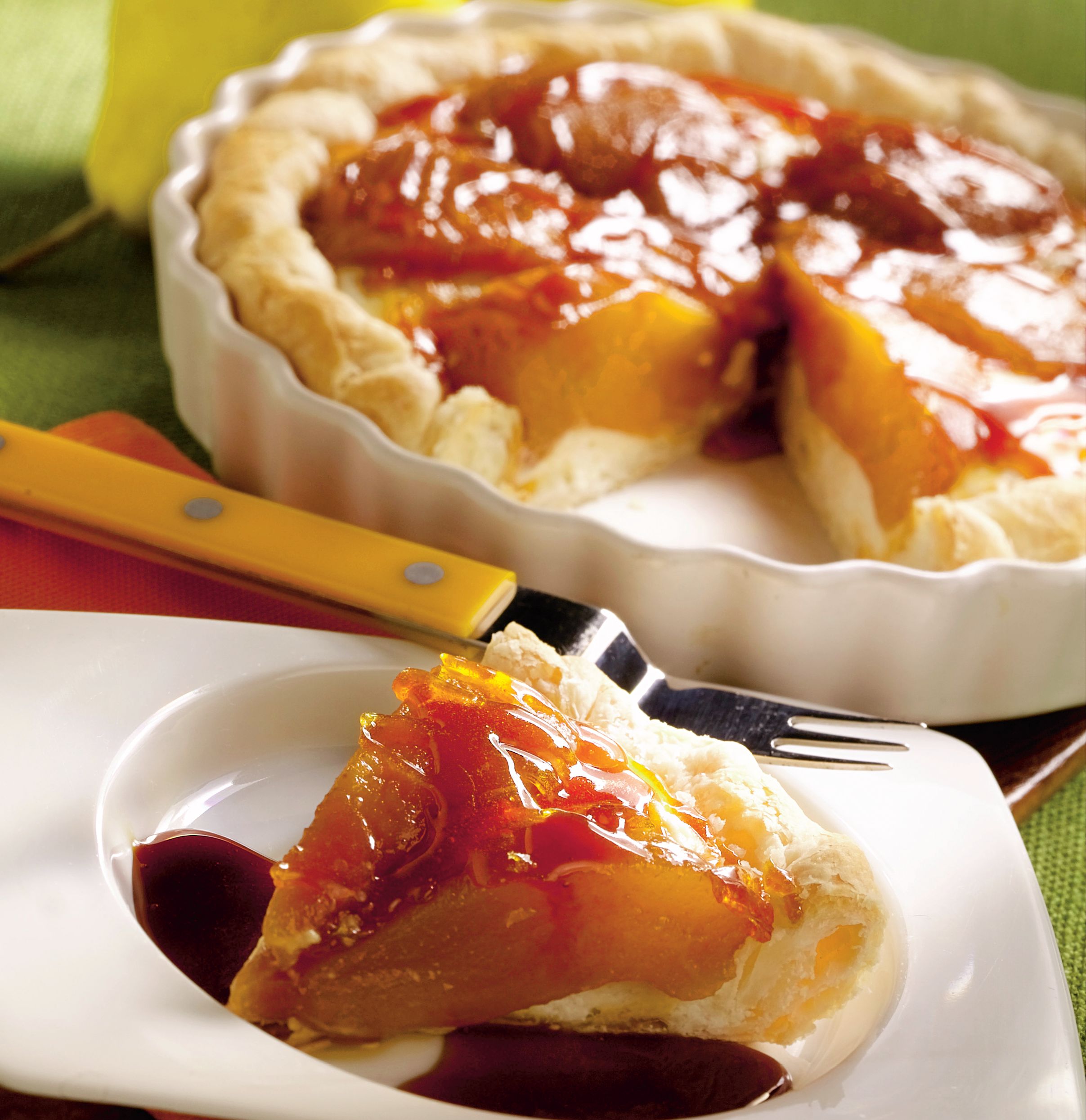 Se bate frisca bine cu zahar pudra. Se asaza frisca in interiorul tartei coapte, se pun perele racite si sosul. Se lasa o ora la rece si apoi se taie si se serveste. Tarta se poate aduce la masa si cu inghetata de menta sau sos de ciocolata.