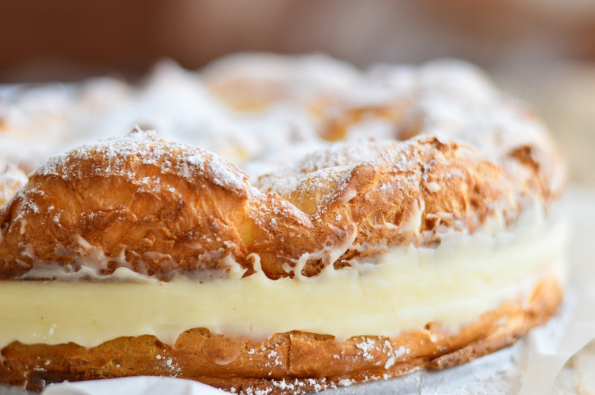 6. Cand blatul de tort ecler s-a racit complet, taie-l in 2 pe inaltime. Asaza un strat uniform de crema de vanilie pe partea de jos a blatului, iar deasupra intinde frisca.