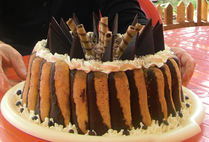 - Se tapeteaza peretii unei forme rotunde cu folie. Se asaza pe margine piscoturi insiropate in cafea si imbracate pe jumatate in ciocolata topita. Se asaza un strat de crema pe fundul formei. Peste crema se asaza un strat de piscoturi insiropate in cafea. Se asaza inca un strat de crema si peste el inca un strat de piscoturi insiropate in cafea.