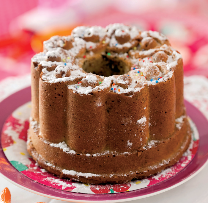 - Se toarna aluatul intr-o forma cu gaura la mijloc, unsa cu unt. Se coace 20 de minute si se lasa sa se raceasca in tava.
