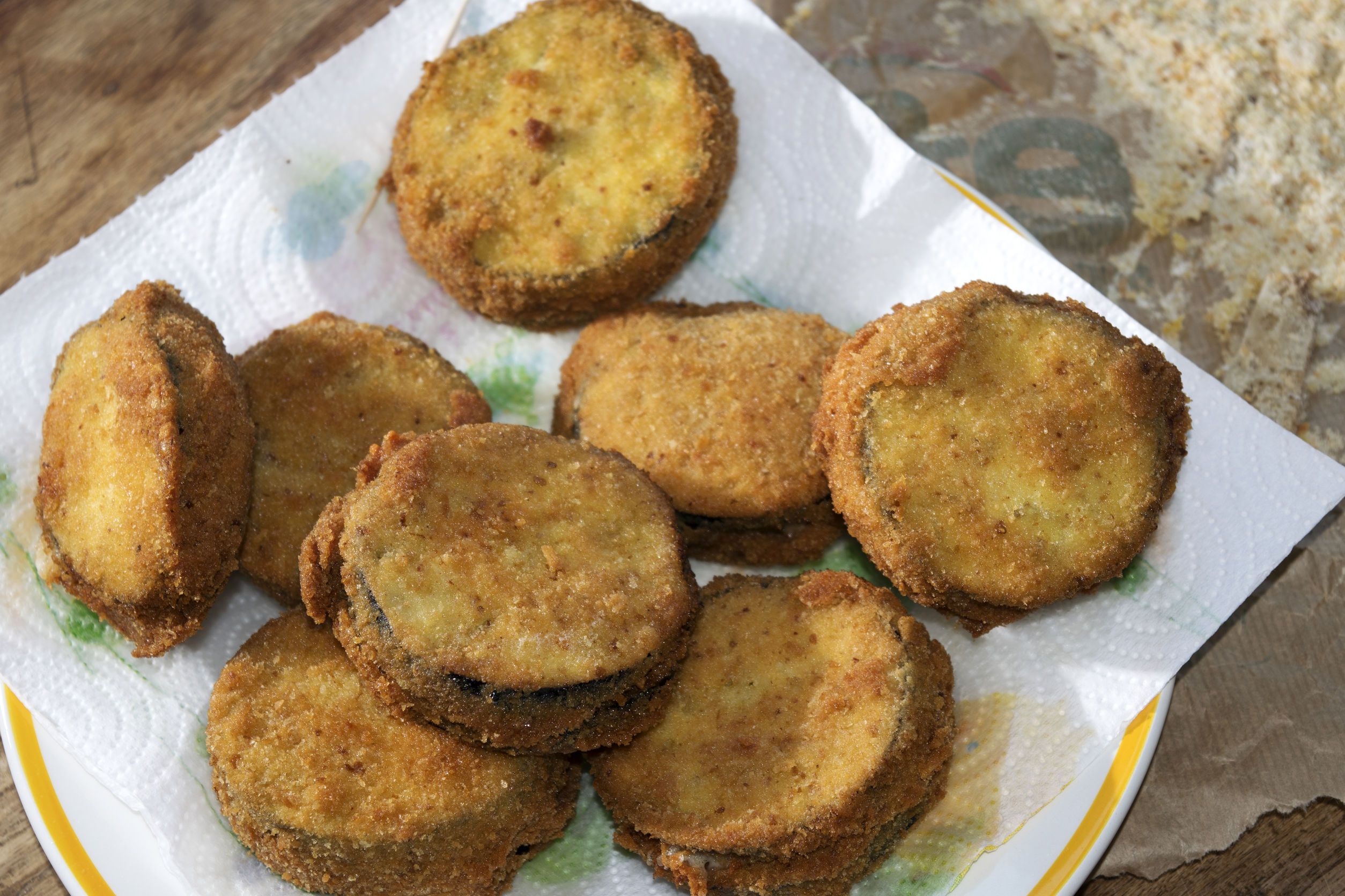 4. Scoate vinetele pane pe hartie de bucatarie, sa absoarba excesul de ulei. Serveste vinetele pane cu sos de usturoi pregatit in casa.