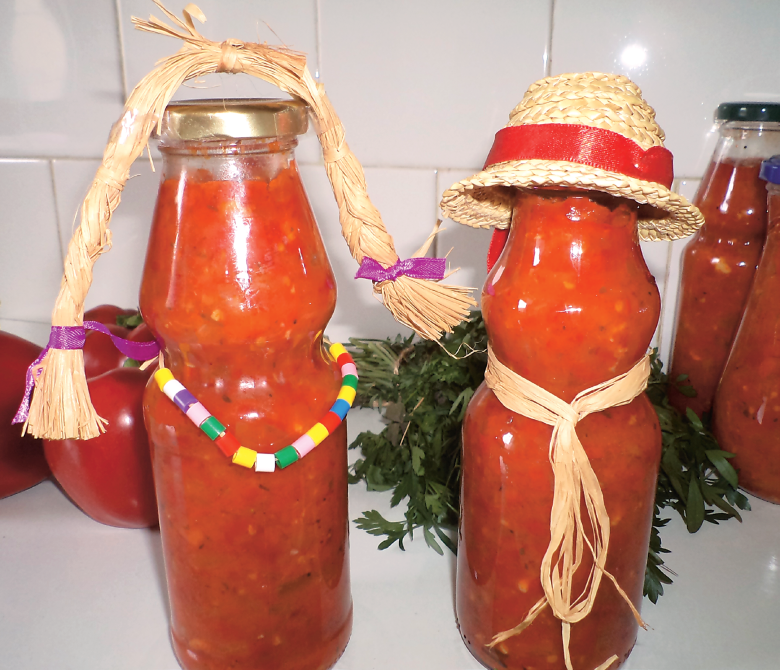 1. Se curata si se caleste ceapa tocata in uleiul incins, se rade radacina de telina si se adauga peste ceapa, apoi ardeii trecuti prin masina de tocat, frunzele de telina tocate, foile de dafin, sucul de rosii, zaharul si otetul.