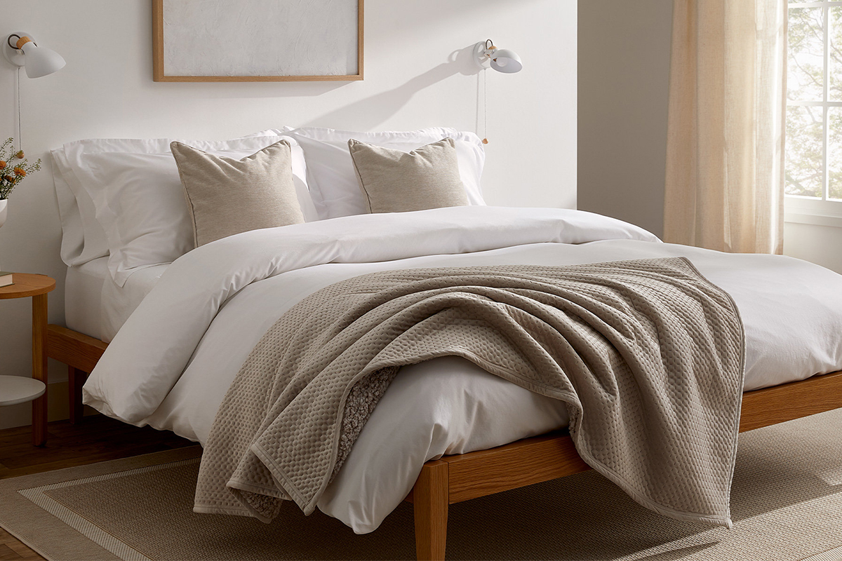 Dacă vorbim de materiale textile pentru a acoperi paturile de copii, o recomandare esențială este ca cel puțin cearceafurile să fie 100% bumbac. Cearșafurile sunt în contact direct cu pielea copilului și utilizarea unui material hipoalergenic va preveni eventualele iritații și dezvoltarea alergiilor. Însă noi recomandăm ca și restul lenjeriei de pat să fie din bumbac. Este mult mai sigur și mai confortabil pentru cel mic.